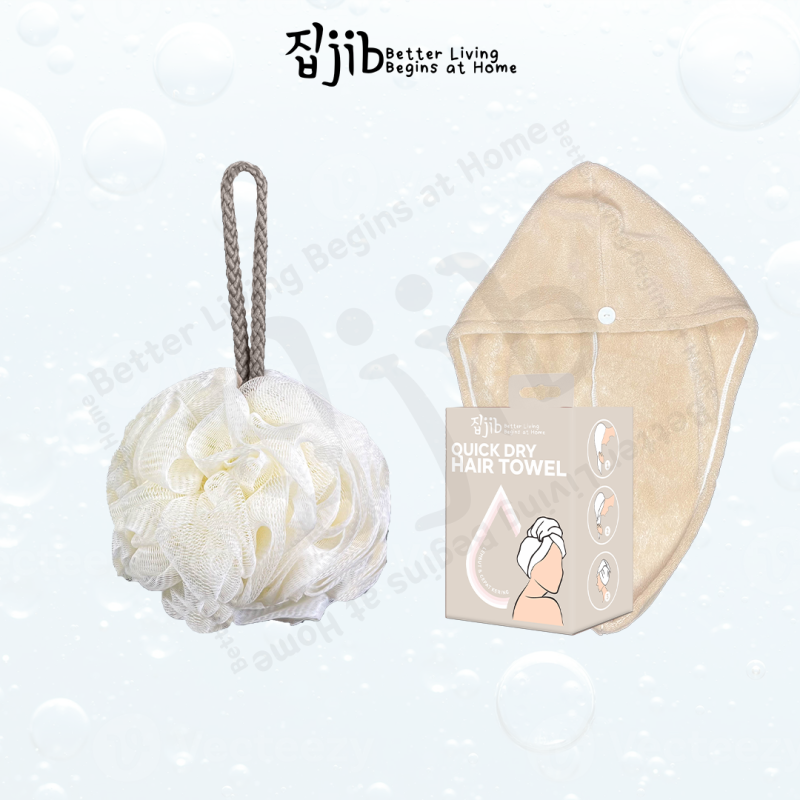 JIB Shower Set terdiri dari JIB Shower Puff / Spon Mandi & JIB Hair Towel / Handuk Keramas Pengering Rambut